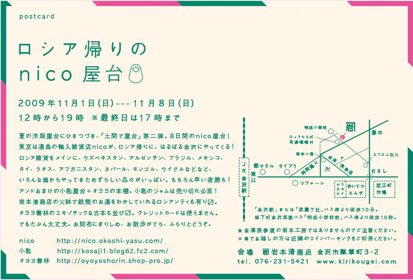 すでにこちらのページでお知らせしておりますが、10月29日(木)~11月12日(木)までは、金沢でのイベント『ロシア帰りのnico屋台』のため連休とさせて頂きます。